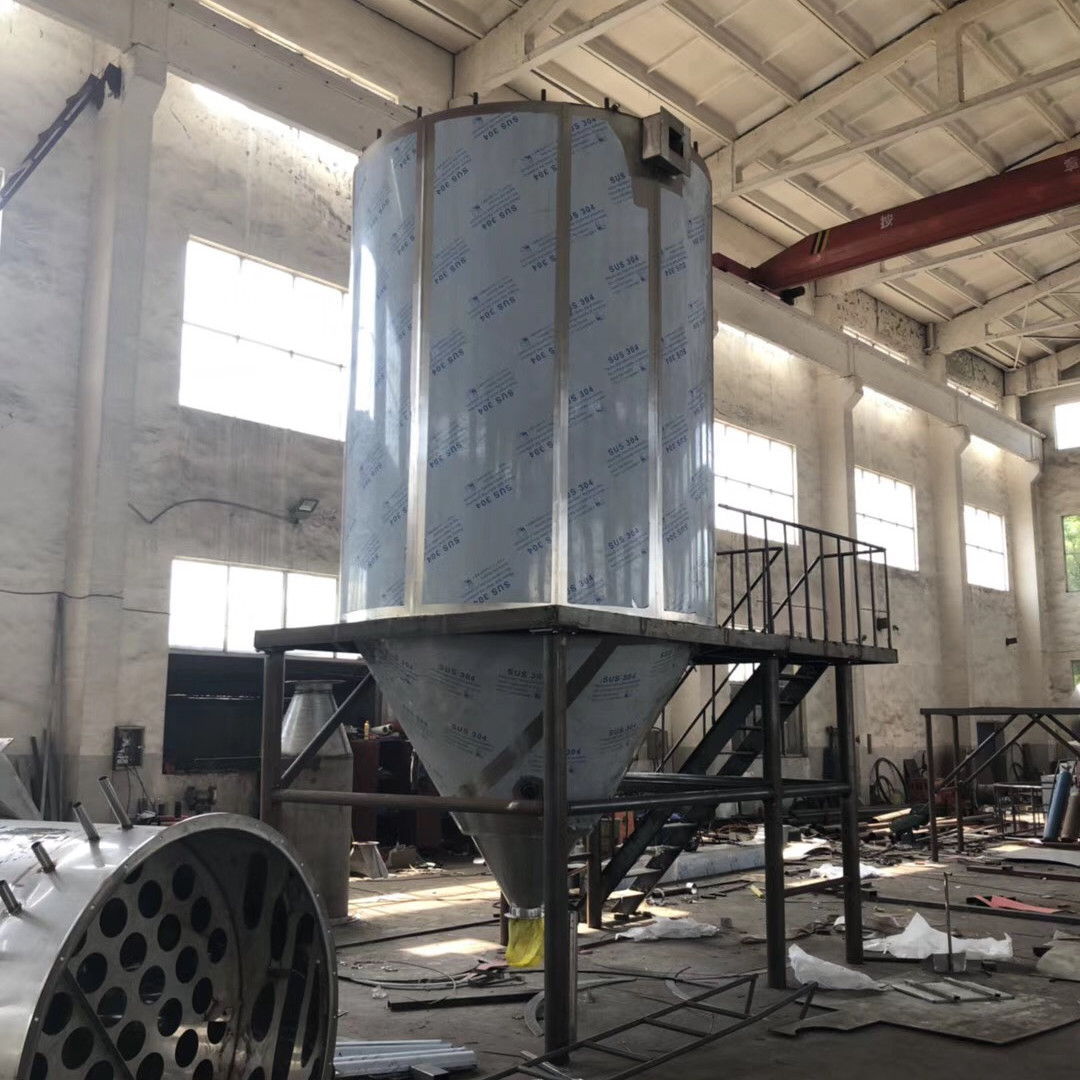 Filtreleme ve ısıtmadan sonra, sıcak taze hava, kurutma odasının üstündeki hava dağıtıcısına girer ve yukarıdan aşağıya düzgün bir şekilde spiral olarak dağıtılır.Aynı zamanda, besleme sıvısı üst atomizöre pompalanır, ardından son derece ince sis sıvı damlasına püskürtülür.Sıcak hava ile kısa süreli doğrudan temas sayesinde nem bir anda buharlaşır, katı madde toz olarak kalır.Kuru toz, kurutma kulesinin ve siklon kollektörün altından sürekli olarak tahliye edilecek, temizlendikten sonra egzoz havası tahliye edilecektir.