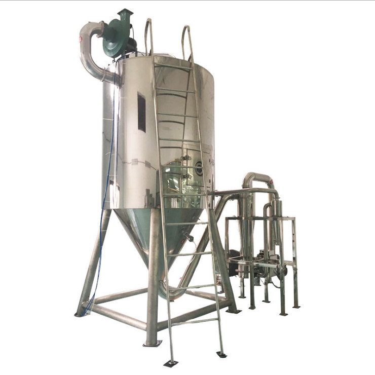 Kurutma odasına eşit olarak spiral şekilli sıcak hava.Kulenin tepesindeki yüksek hızlı santrifüj spreyden geçerek, malzeme sıvısı dönecek ve son derece ince sis sıvı boncuklarına püskürtülecektir. Isı havası ile çok kısa temas süresi sayesinde, malzemeler kurutulabilir. bitmiş ürün.Bitmiş ürünler ayırıcı olacaktır.Atık gaz üfleyiciden tahliye edilecektir.